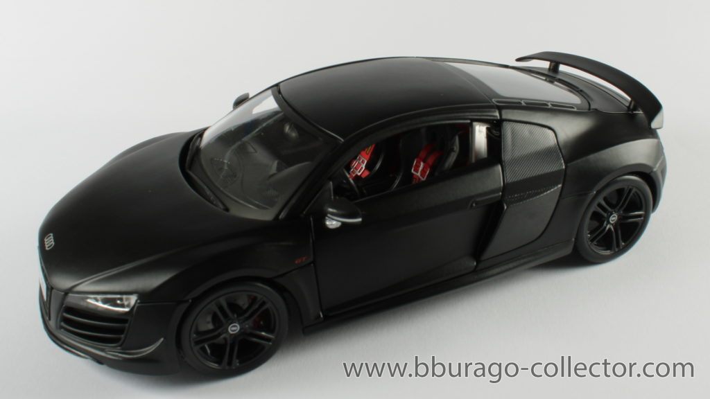 Besonderes / MerkmaleSondermodell für den Discounter Aldi / Maisto - Derivat, welches mit einer Bburago - Grundplatte und Verpackung modifiziert wurde. / schwarzes Interieur / rote Schutzbügel / rote Überrollbügel / roter R8 GT Schriftzug auf der Seitenschweller und Bodenmatte / rote Bremssättel / Kennzeichen : HN GT 80030